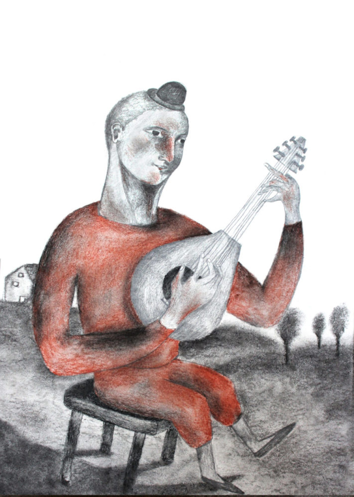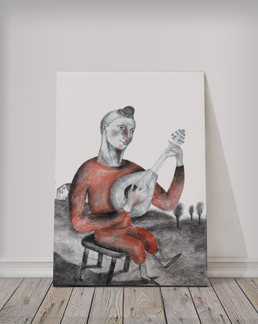Nuestra lámina ilustrada “Bandurria” captura la belleza de un personaje circense que sentado con serenidad, toca un pequeño instrumento de cuerdas. La escena parece suspendida en un instante íntimo, la postura de las manos, en la curva sensible de los dedos sobre la madera, en la mirada lejana del músico.