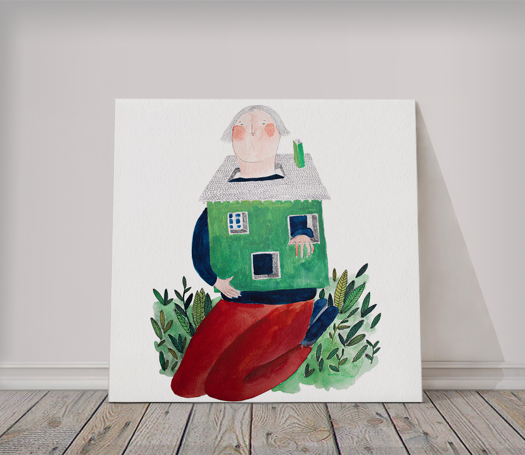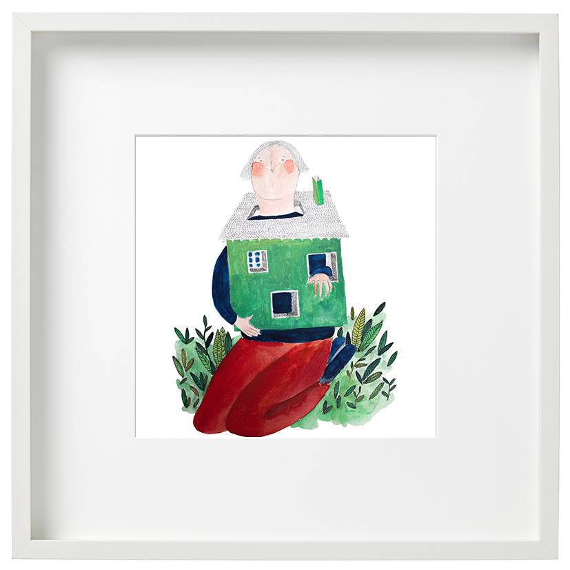 La lámina ilustrada “Caracol” es una pequeña oda a quienes llevan su hogar a cuestas. Sentado entre plantas, un personaje descansa habitando una casita verde que lo envuelve como un caparazón. Esta imagen, realizada en acuarela sobre papel de algodón, habla de lo esencial. De esa necesidad tan humana de refugio, pero también de la posibilidad de habitarse a una misma persona como casa. Como los caracoles, que avanzan lentos pero seguros, este personaje nos recuerda que no hace falta llegar rápido ni muy lejos para sentir que estamos en el lugar correcto. Que el hogar puede estar en un gesto, en una postura, en una forma de mirar el mundo.