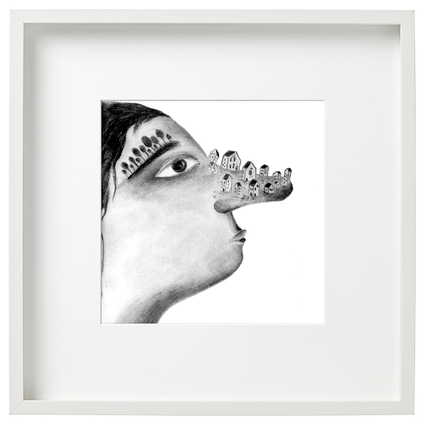 Realizada a mano en carboncillo, en blanco y negro, esta obra habla del vínculo entre lo humano y lo doméstico, entre el rostro como identidad y la casa como memoria. El trazo es expresivo, con sombras suaves que evocan una atmósfera onírica. Las casitas, diminutas y ordenadas, parecen haber encontrado un lugar cálido en el gesto quieto de una nariz. Hay humor y poesía en la propuesta, un juego visual que transforma el retrato en una geografía emocional.