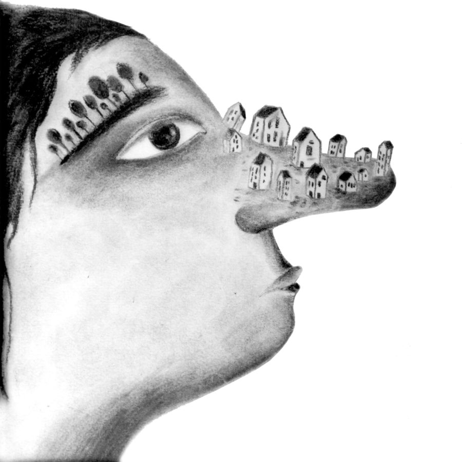 Nuestra lámina ilustrada “Nariz casa” es un retrato poético donde el límite entre cuerpo y paisaje se desdibuja con ternura. Sobre la nariz prominente de un rostro, han crecido pequeñas casas que trepan por su ladera como si fuera una colina habitable. Es una imagen extraña y encantadora que invita a imaginar la intimidad como un territorio donde construir refugio.