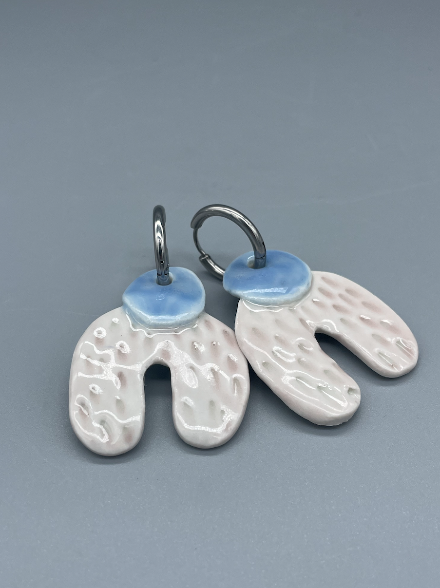Pendientes geometría azul-rosa de porcelana blanca. Modelada y esmaltada a mano por Anita Trenzamundos.