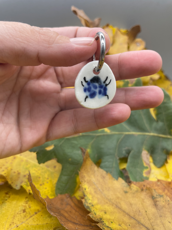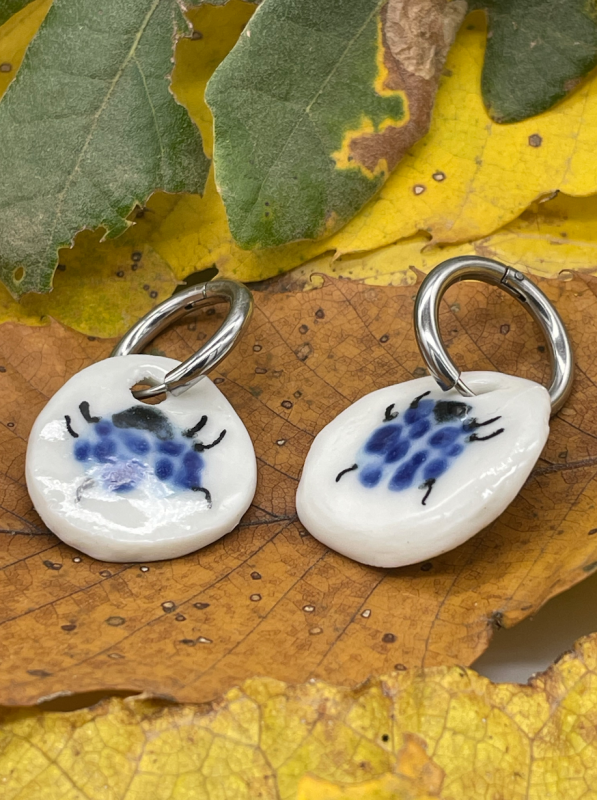 Pendientes mariquitas azules de porcelana blanca. Modelada y esmaltada a mano por Anita Trenzamundos.