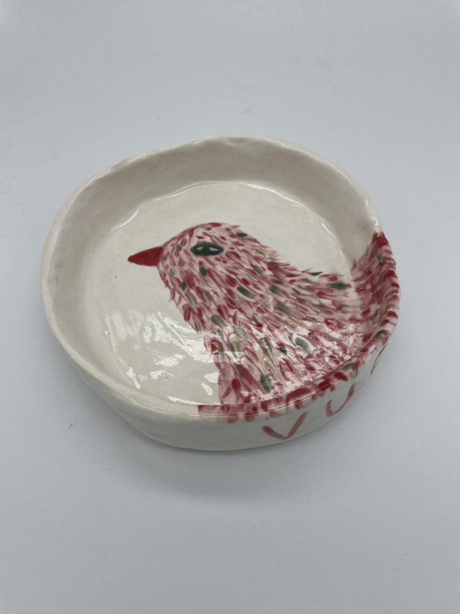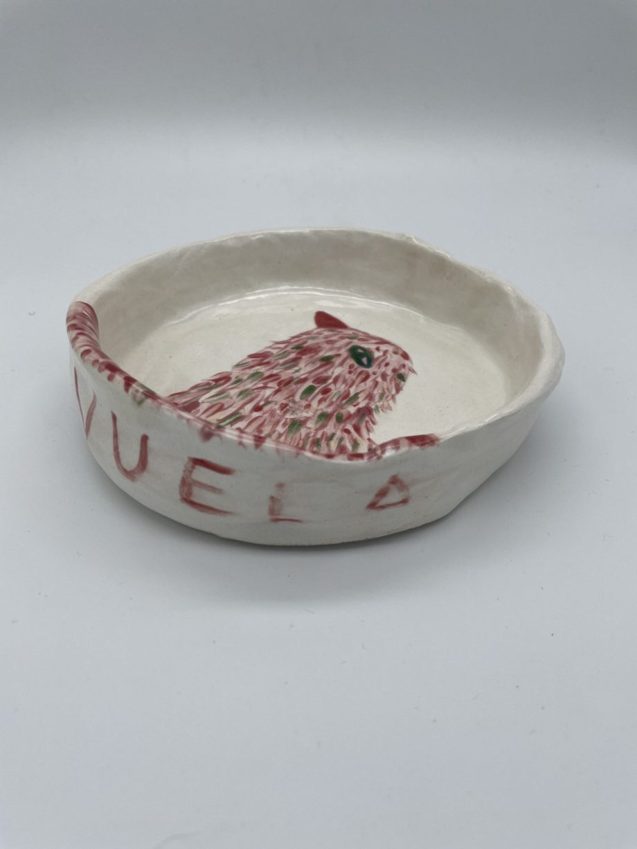 Plato vuelal de arcilla blanca hecho y pintado a mano por Anita Trenzamundos.
