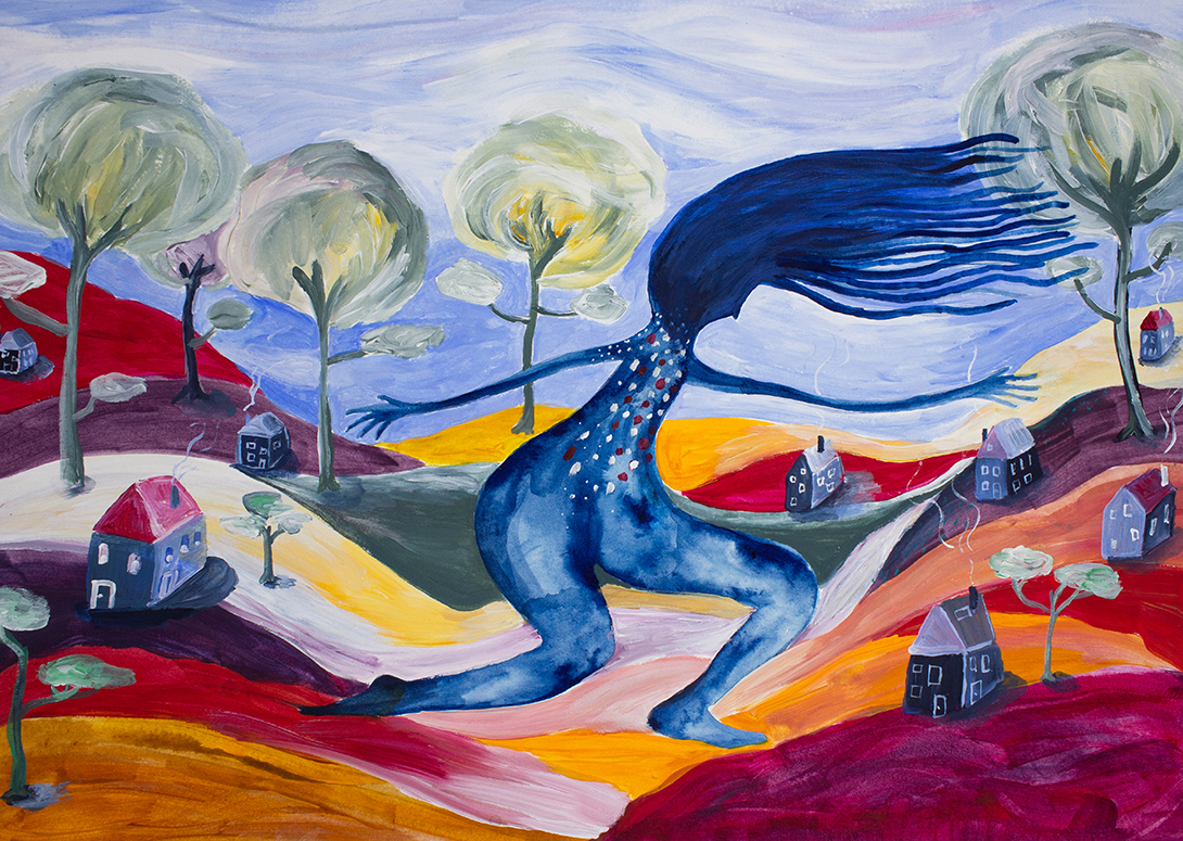Sombra caminante lámina realizada a mano. Técnica: acuarela y acrílico